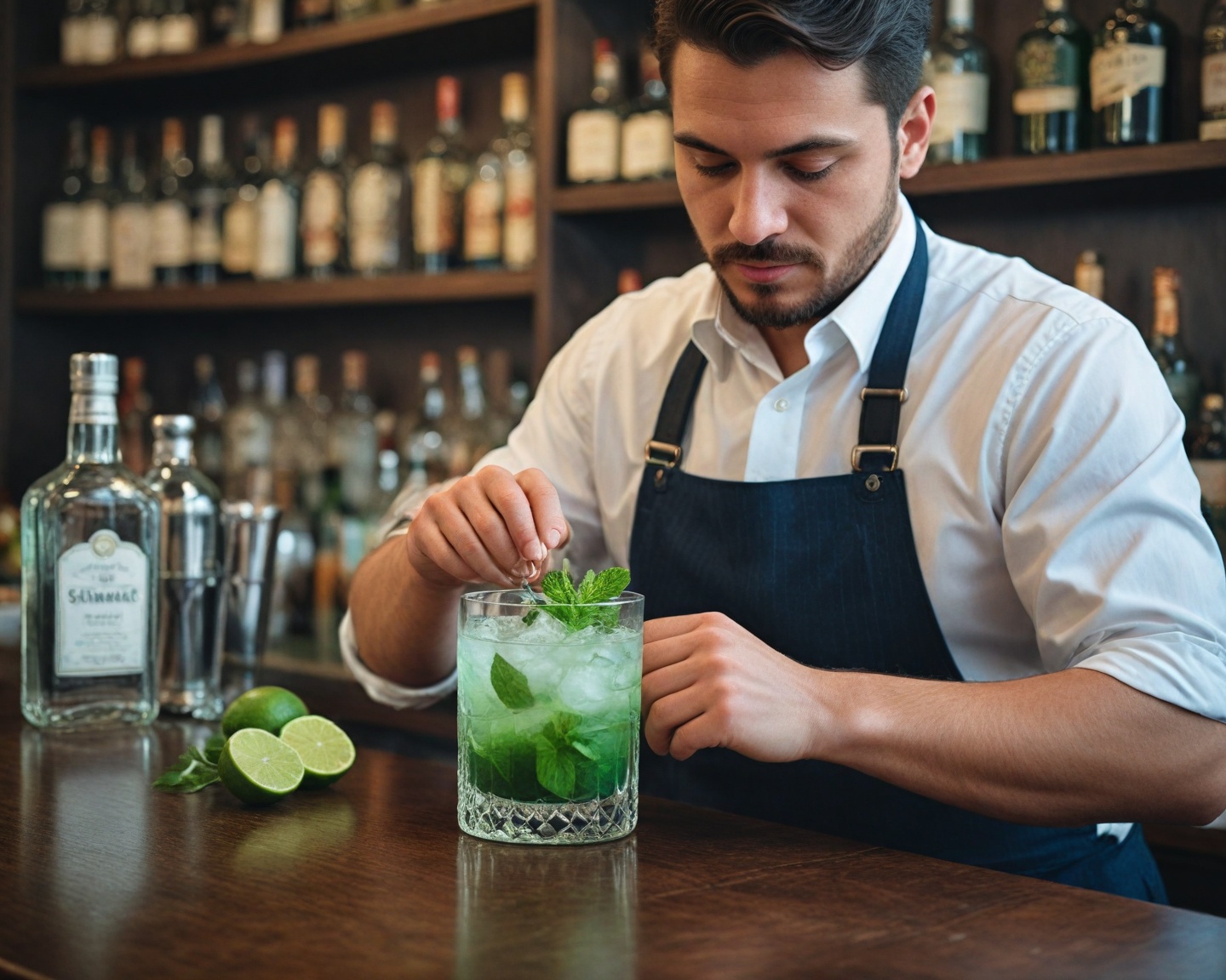 Maceração da Menta: Em uma coqueteleira, coloque as folhas de menta e o açúcar (ou xarope). Macere suavemente as folhas para liberar os óleos essenciais sem danificá-las completamente.